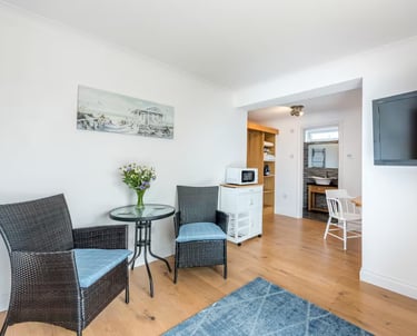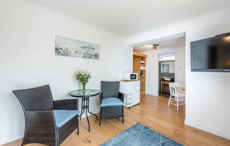 To ensure you can enjoy food from many local suppliers/restaurants and takeaways we have provided a kitchenette trolley stocked with essential crockery and cutlery and a bistro table and chairs. There is also microwave, fridge, kettle and toaster plus tea & coffee making facilities.